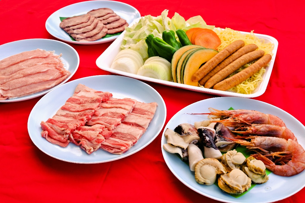 牛カルビ・牛タン・豚ロース・魚介類・ウインナー・焼きそば・野菜